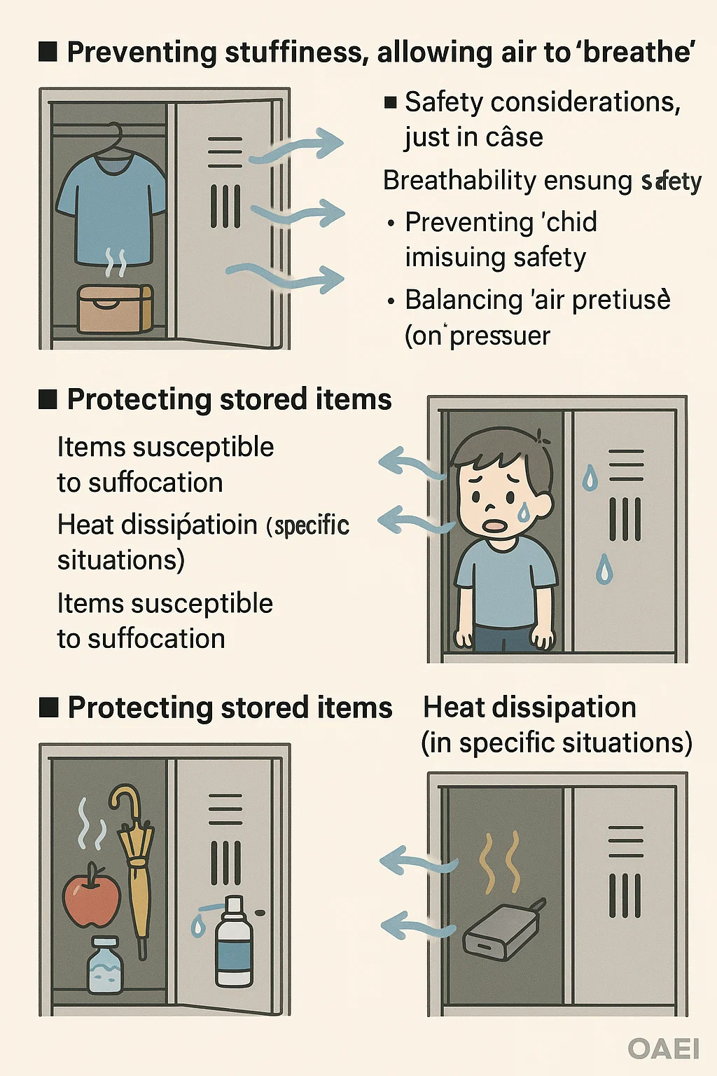 Предотвращение «потения»: в холодную погоду температура внутри шкафчика высокая (например, из-за хранения горячих предметов), а наружная температура низкая, что приводит к образованию конденсата на внутренних стенках (например, «запотеванию» на внешней стороне чашки). Вентиляционные отверстия помогают сбалансировать температуру и влажность, уменьшая «потение» и защищая книги, документы или чувствительные к влаге предметы, хранящиеся внутри.